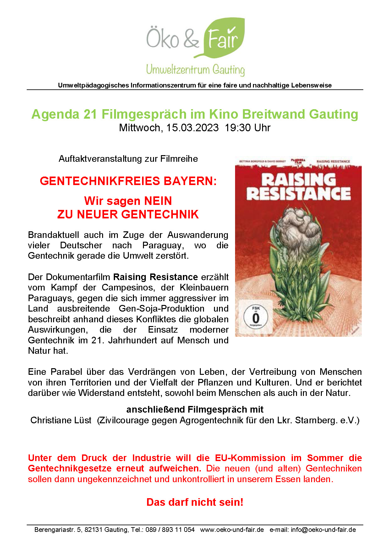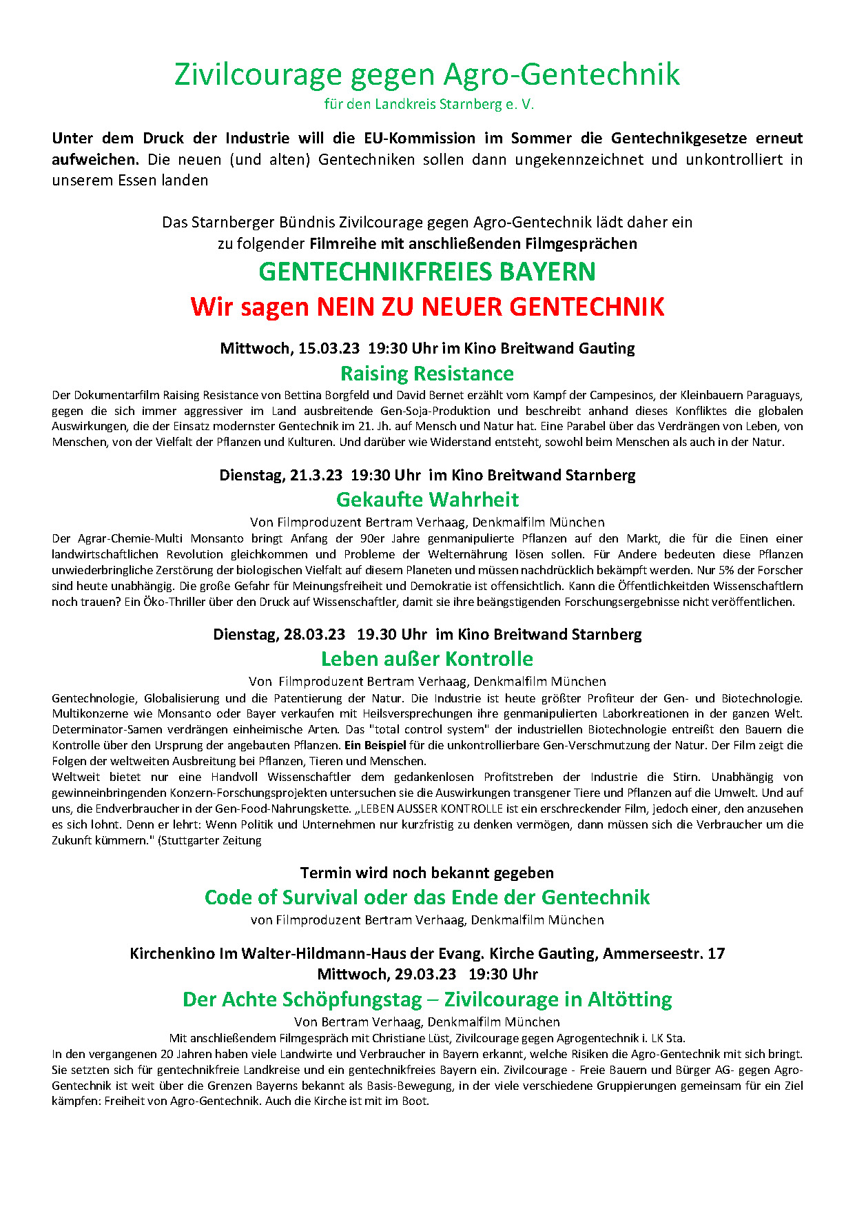 Wir laden Euch deshalb gemeinsam mit dem Starnberger Bündnis Zivilcourage gegen Agro-Gentechnik zur Auftaktveranstaltung der folgenden Filmreihe mit anschließendem Filmgespräch ein: