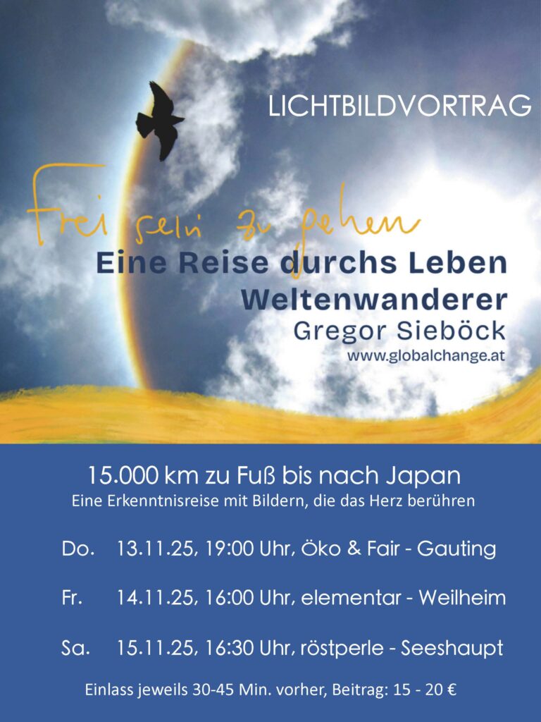Der „Weltenwanderer“ Gregor Sieböck aus Österreich kommt wieder einmal zu uns ins Umweltzentrum für einen Vortrag über seine Welt-Wanderungen und zur Vorstellung seines neuen Buches. Und wer an dem Donnerstag, 13. November keine Zeit hat zu kommen, kann den Vortrag auch am Freitag in Weilheim oder am Samstag in Seeshaupt ansehen. Gregor haben wir im Juli bei einem GWÖ-UnternehmerInnen-Ausflug ins Waldviertel zu Sonnentor und nach Schrems zu Heini Staudinger, dem Gründer der Waldviertler Schuhe, nach langer Zeit wieder getroffen und er hat uns sofort versprochen mal wieder nach Bayern zu kommen.
