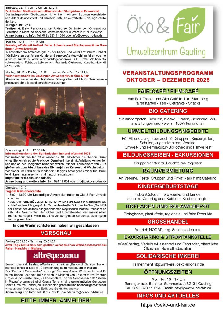 wir haben wieder einen bunten Reigen von Veranstaltungen organisiert. Darunter wieder interessante Filmgespräche im Rahmen von Agenda21, unsere Solidarreise nach Süditalien und ein sehenswerter Lichtbildervortrag mit dem Weltenwanderer Grogor Sieböck „Frei sein zu gehen – eine Reise durchs Leben“