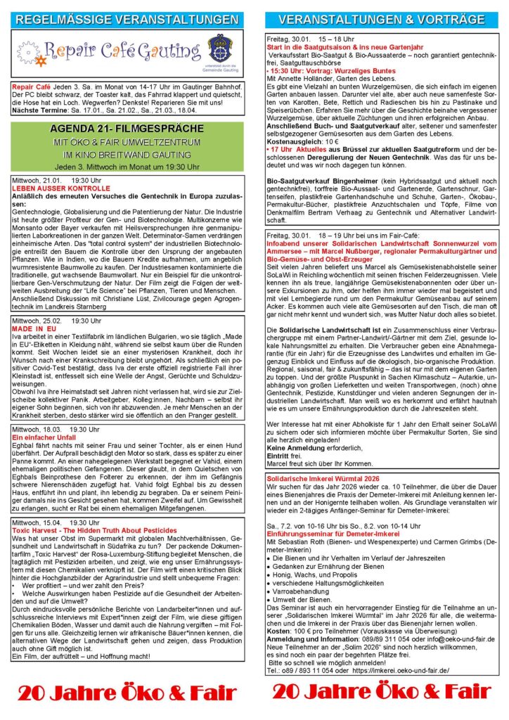 Am Samstag, den 17.1. geht’s los mit Repair-café, am Mittwoch, 21.1. Agenda-Kino aus traurigem Anlaß der quasi beschlossenen Deregulierung der Gentechnik auf EU-Ebene mit dem Film „Leben außer Kontrolle“, unserer alljährlichen Saatgutauftaktveranstaltung Ende des Monats und vielem mehr.