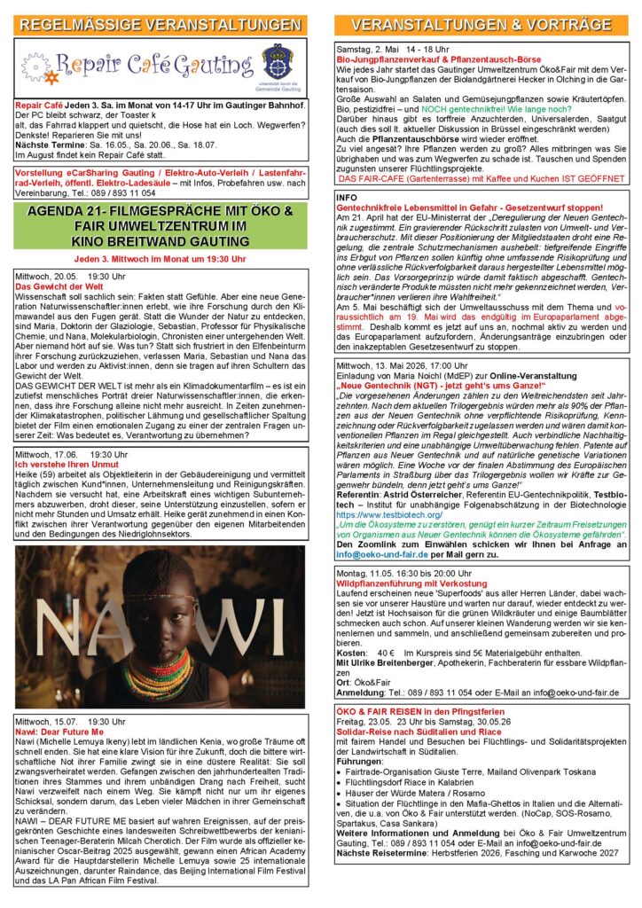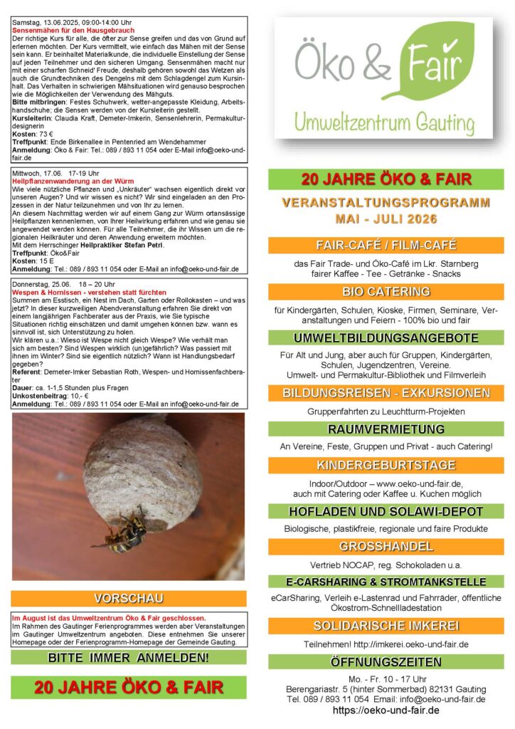 soeben haben wir das neue Sommerprogramm zum Druck gegeben. Von Mai bis Juli gibt es wieder jede Menge Veranstaltungen rund um Ökologie, Klimaschutz, Menschenrechte und nachhaltiges Leben. Die einzelnen Termine können Sie hier herunterladen und anschließend in Ihren Outlook-Kalender speichern.